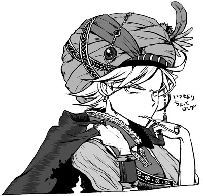 もっとお金持ちぽい(成金系)格好させてみたかったなーという反省点。何回か落書きしてもみたんですけど、その度にお前本当におめかし似合わないな…と残念な結果を残しました。上品な商人って感じの服もだめそう。だめでした。