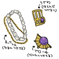アクセサリーも3種類あるけど、必要があるもの以外は付けないんじゃないでしょうか。特に腕輪、全身図以外で多分描いた事なかった…。ネックレスは多分虫除けなどの効果があるからつけるとかでしょう。