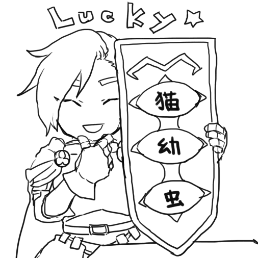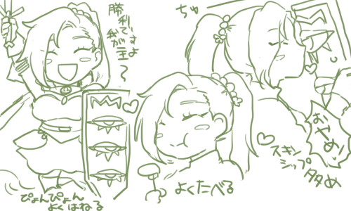 猫幼虫、アイレ、鳳凰蘭、下水道、オドゥ、もくず、(スライムの顔三つ)、パラショ、かばう、もずく、旭美人、不死鳥、酒盛り、大爆発、(ハート三つ)、魔物飯、トーク、大爆睡、カジノ、大喧嘩、すけべ、周回業、忘れました、虚無