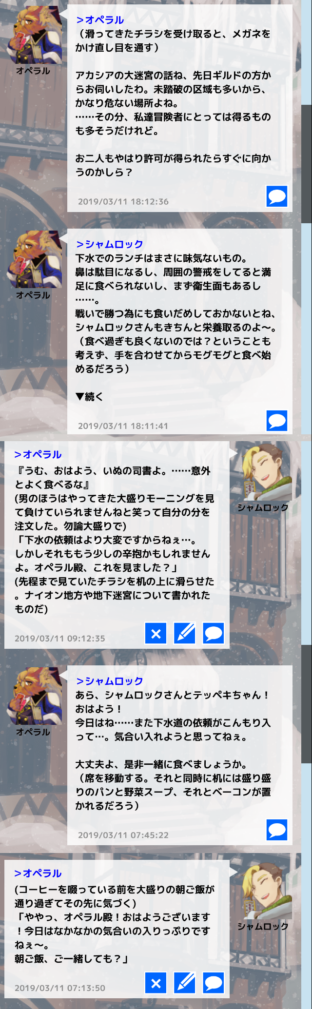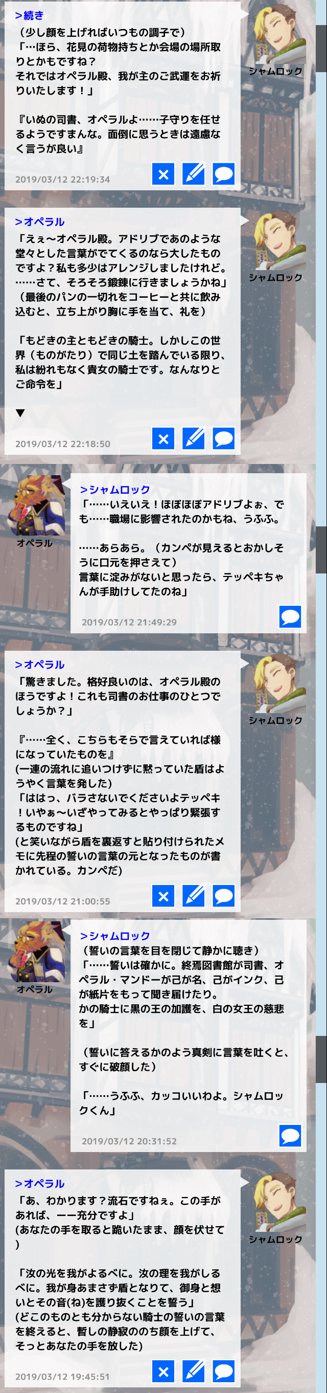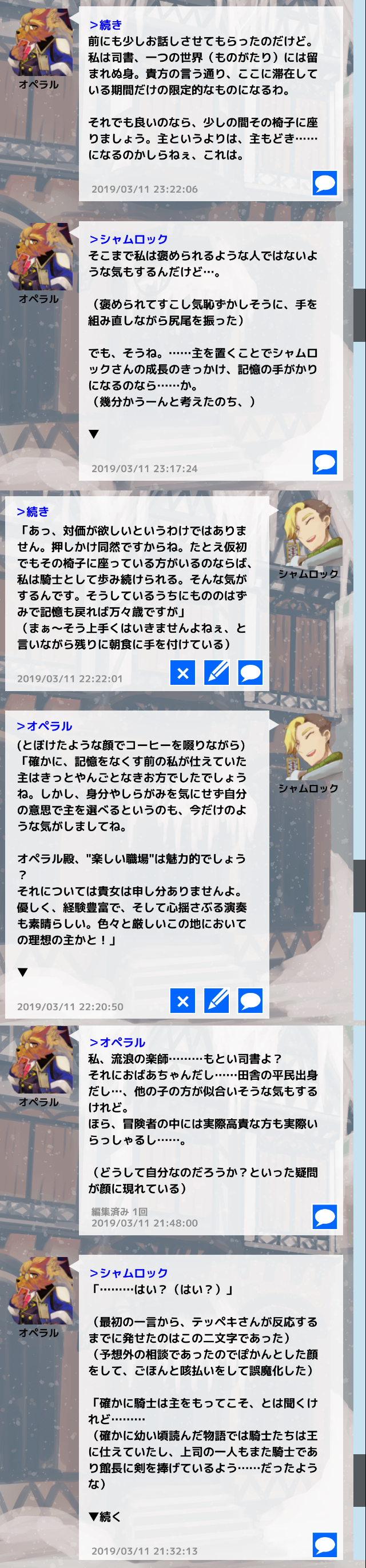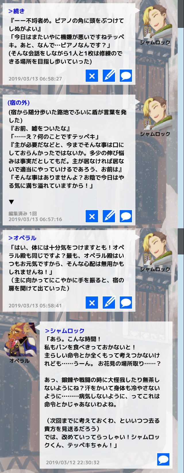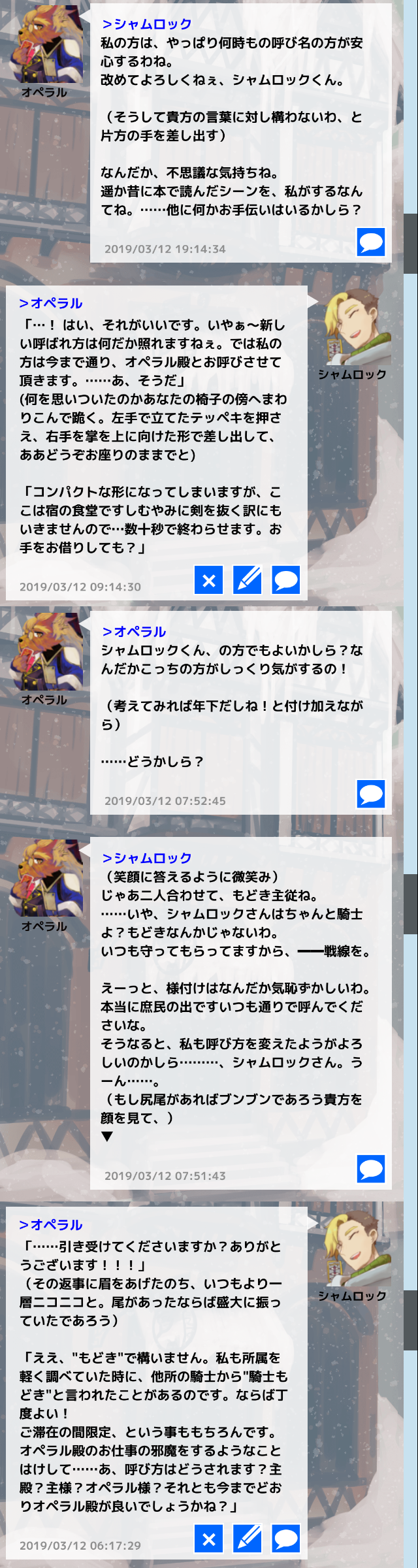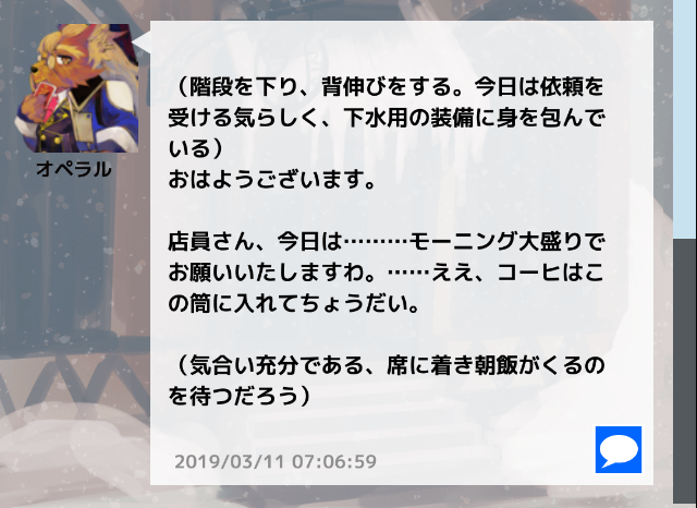 コメントへ 馴染みの天狼の宿にて、オペラルさんとの穏やかでゆるふわな主従関係の始まりでした! オペラルさんからの呼び名がシャムロックさんからシャム(ロック)くんになり大変萌えます。 あらかじめ関係相談させていただいてからのRPだったんですが、改めて見るとなかなかの押しかけロールでどきどきします(あまり強気に出れない中の人)。記憶喪失の事出すと人のいいオペラルさん引けないじゃない…?お前……。 そして…… 主従関係に加えて無自覚片思い関係も添えさせていただきました。 これ考えながらログを読み直すとお、お前~~~ってなってしまいます。 テッペキの方が知ってしまっているけど、特に口出す事もなく穏便に過ごせと思っている……。