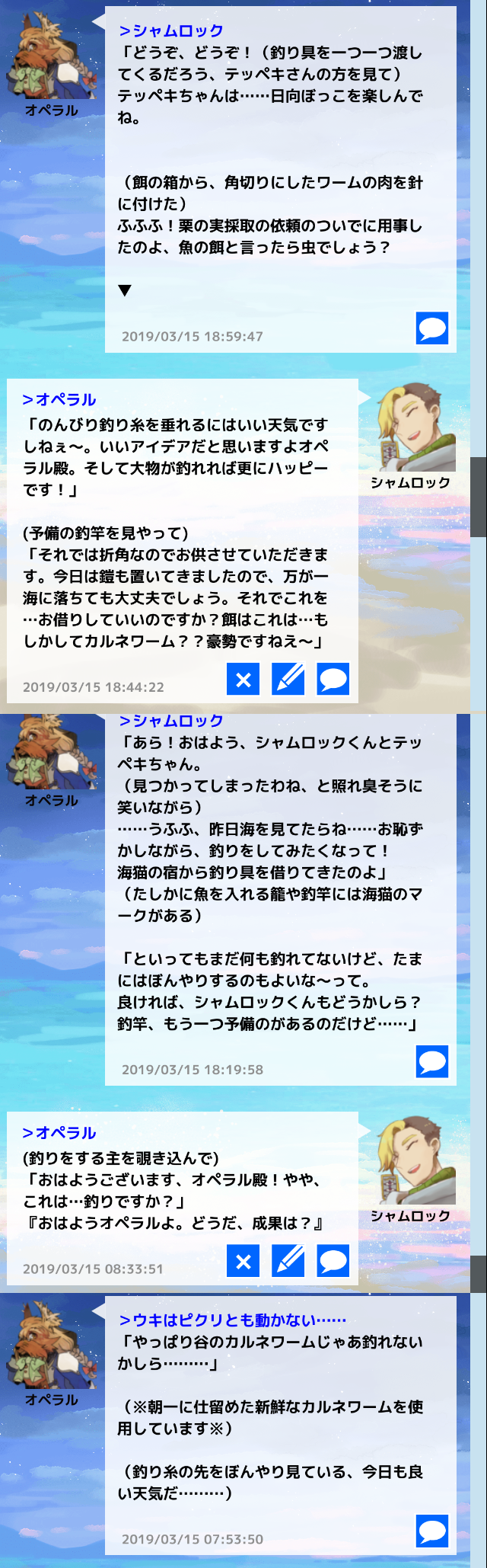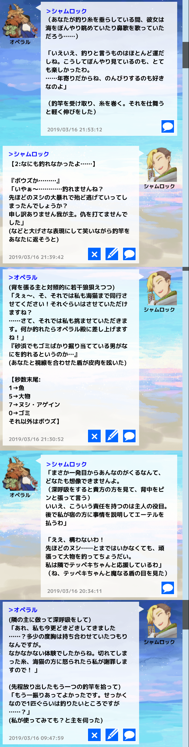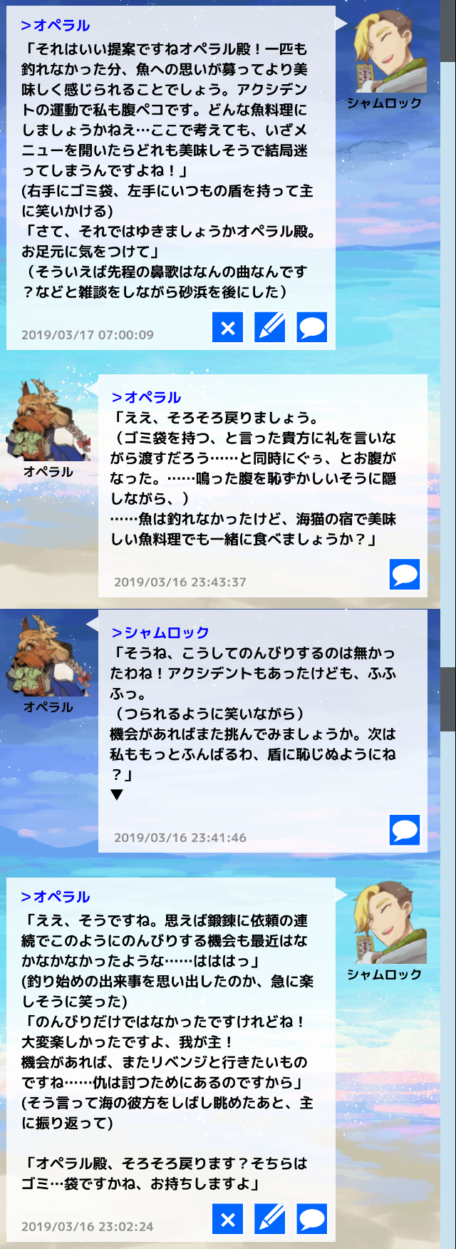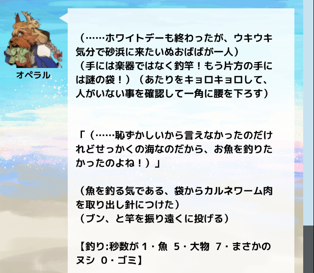 コメントへ 結成したて直後ぐらいで海釣りをしたゆるふわ主従のログがどたばたで楽しくかわいかったので! まずウキウキ釣りする犬のおばあちゃんというのが可愛すぎるのだ……。 このまま二人で海にドボンしていたらどうするのだろうか。オペラルさんは泳げるのか。シャムは後日泳げることが判明しました。 ボウズのまま終わるのもゆるふわ~。