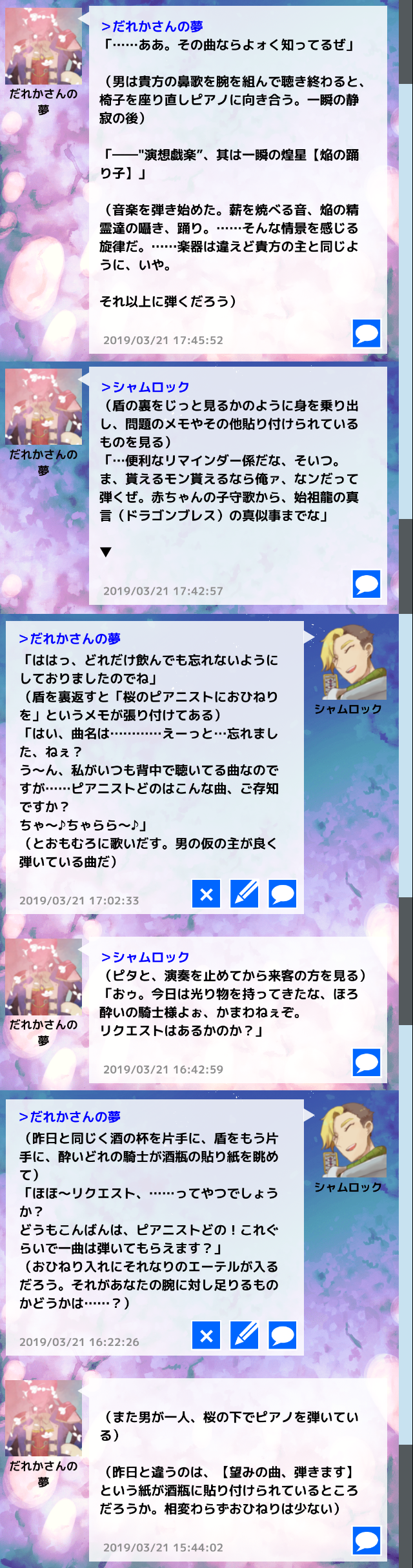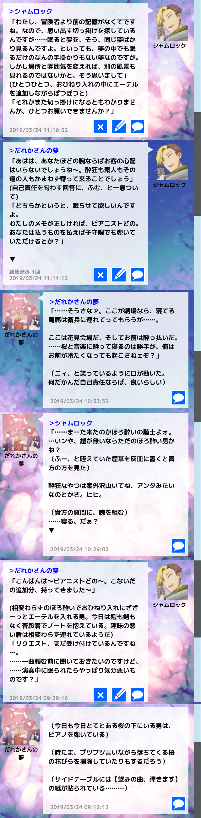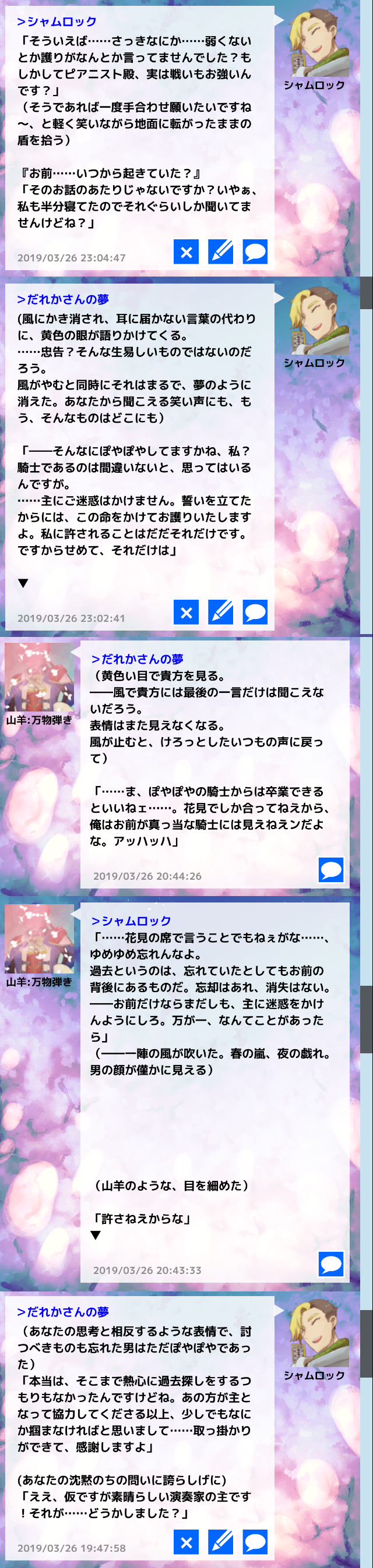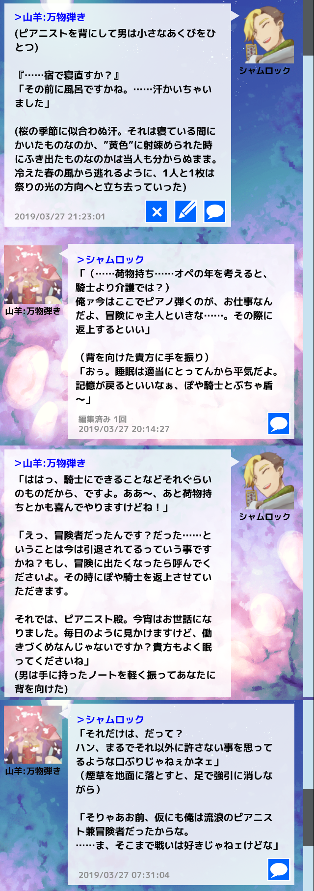 コメントへ ▲またまた別の日、同じ場所にて▲ ▲また別の日、同じ場所にて▲ オペラルさんの旦那さんが期間限定で実装されるらしいとのうわさを聞きつけてダッシュで話しかけにいった思い出。旦那さんめっちゃいいキャラなさってるでしょ……ファンです……最初は山羊だということは伏せられていたので、4/1に近づくにつれお名前が変わっていったりしてぞくぞくしました。この間オペラルさんは職場に帰ってらっしゃるということで、ひたすらテッペキと一緒に花見会場を酔っぱらいながらブラつくシャムでした。要は寂しいのだ。そして記憶の底から「討つべきを討て」というワードを引っ張り出してもらうのでした。つづきます