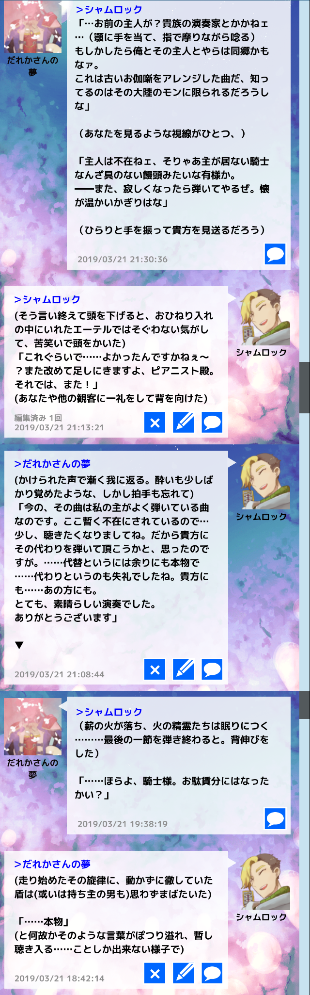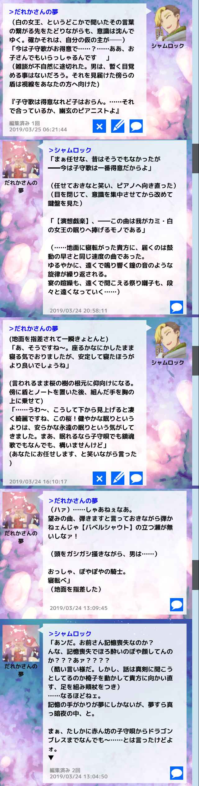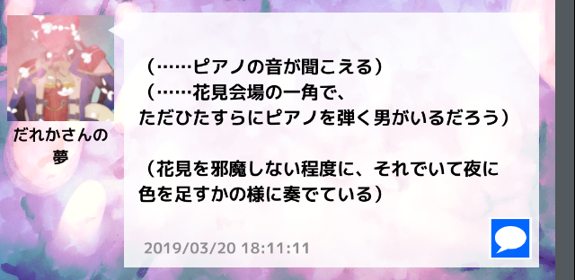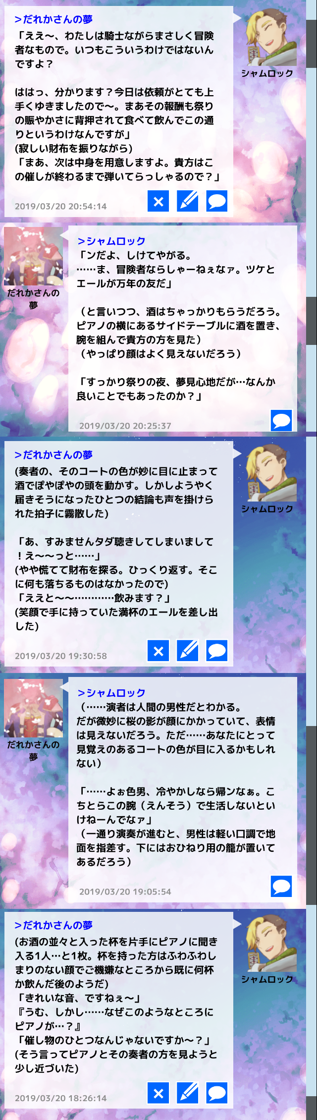 コメントへ ▲またまた別の日、同じ場所にて▲ ▲また別の日、同じ場所にて▲ オペラルさんの旦那さんが期間限定で実装されるらしいとのうわさを聞きつけてダッシュで話しかけにいった思い出。旦那さんめっちゃいいキャラなさってるでしょ……ファンです……最初は山羊だということは伏せられていたので、4/1に近づくにつれお名前が変わっていったりしてぞくぞくしました。この間オペラルさんは職場に帰ってらっしゃるということで、ひたすらテッペキと一緒に花見会場を酔っぱらいながらブラつくシャムでした。要は寂しいのだ。そして記憶の底から「討つべきを討て」というワードを引っ張り出してもらうのでした。つづきます