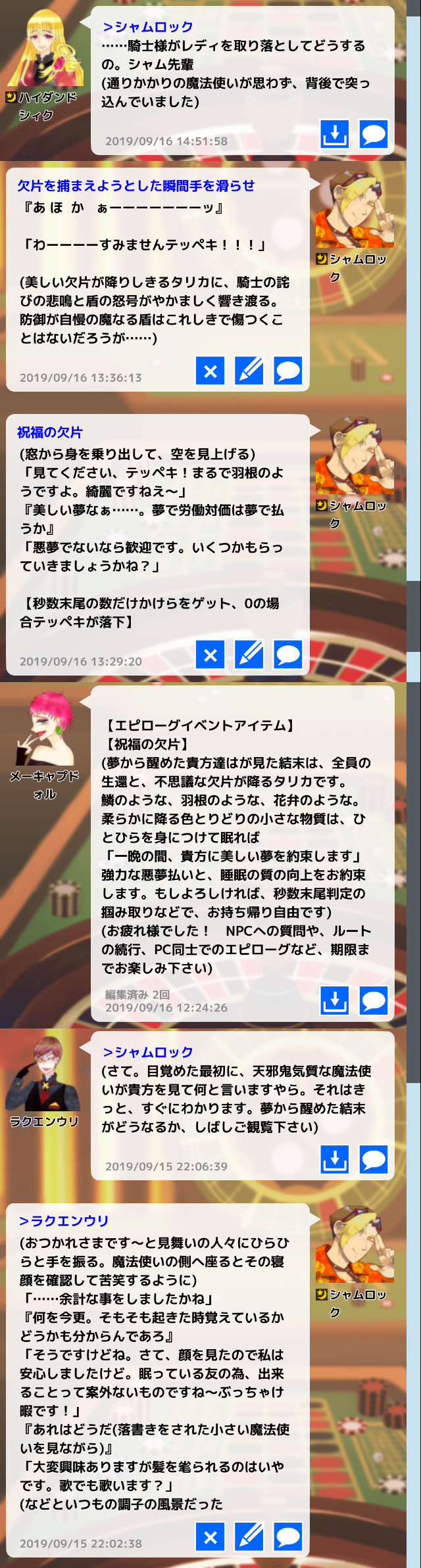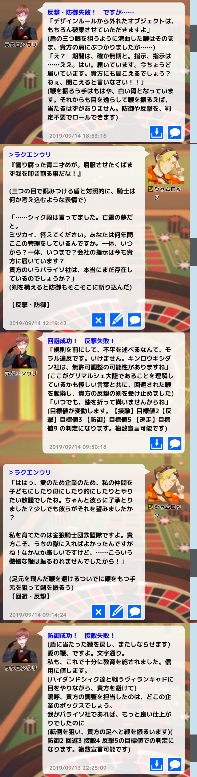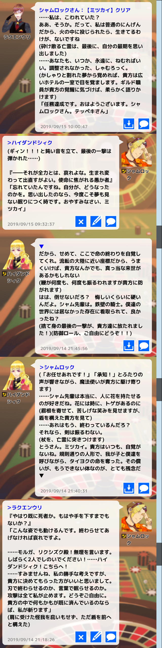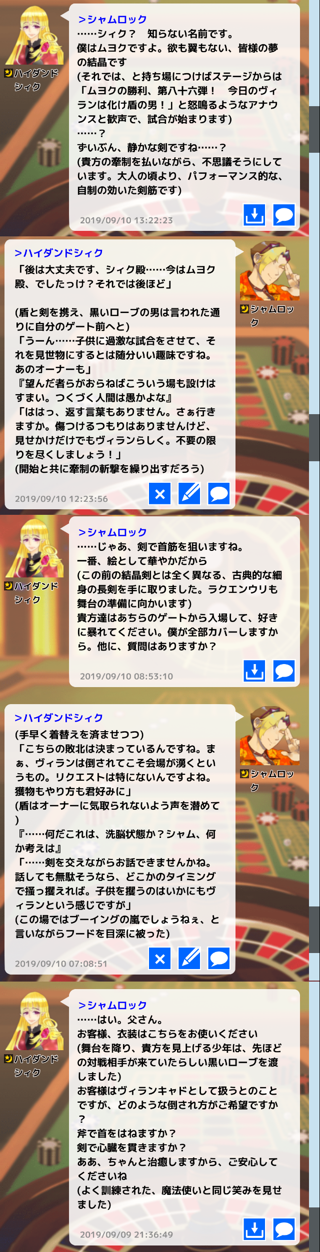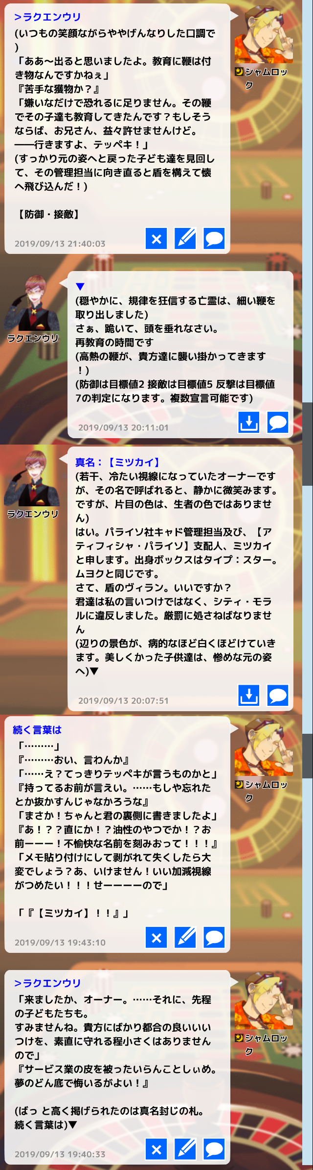 コメントへ といぼっくすさんちのイベント個室、「人造楽土と醒めぬ夢」に参加させていただきました。なんと参加者毎にルートとラスボスが違って一人一人に個室主がレスを返しながら進めていくという作業量がすげーやつなのだ……。おつかれさまでした……!おかげでログ取りとまとめも楽、ということでせっかくのシャムロックルートまとめさせていただきました。タンクらしい戦いをさせていただいて大感謝!ダンド先生との交流も深まってハッピー!(一方的に)親しくなると呼び名から敬称が消えたりします。 こちらボスバトルゲーム画面風になります。ちょうど面子も併せて四人だったので…!!後ろにヴィランキャドの子供たちもいるのよ!