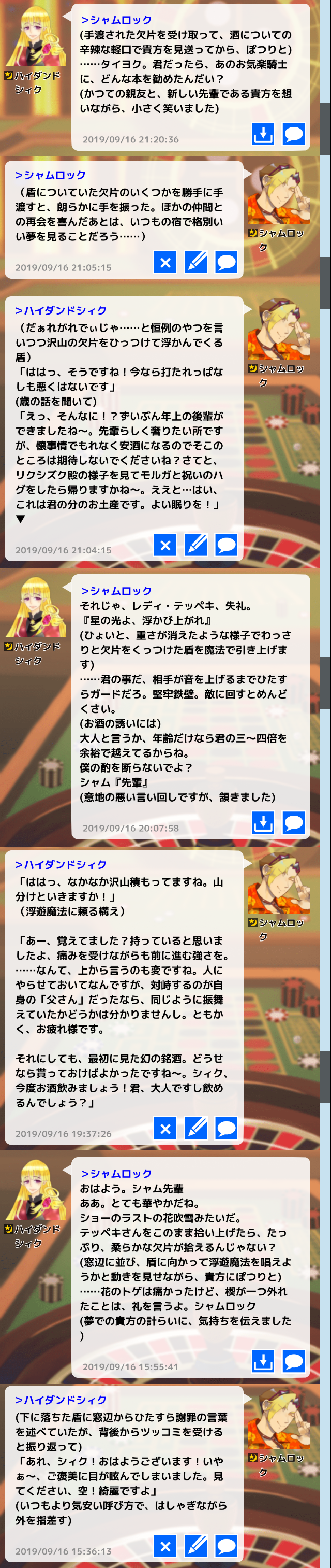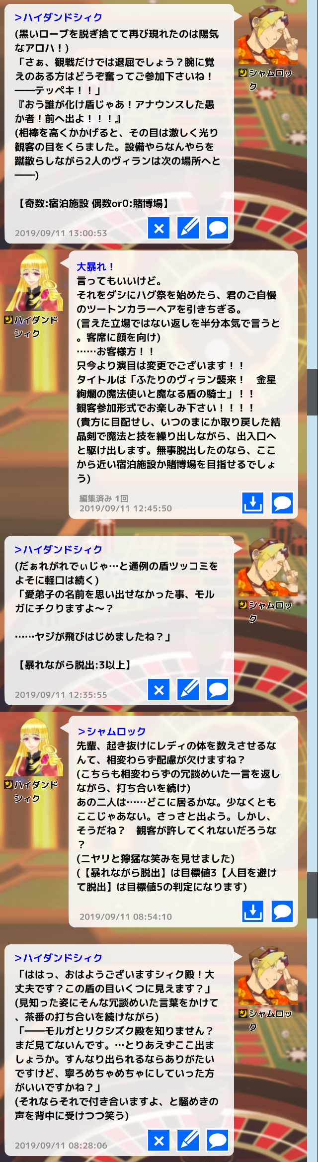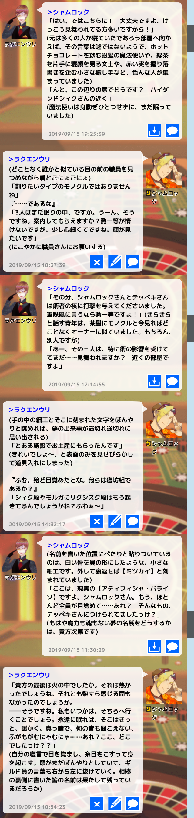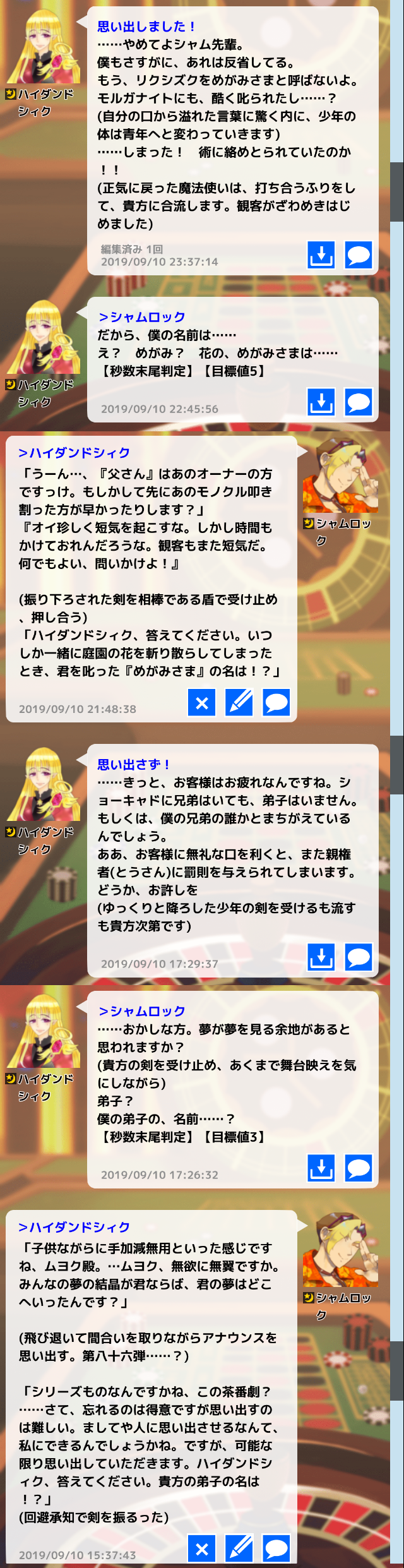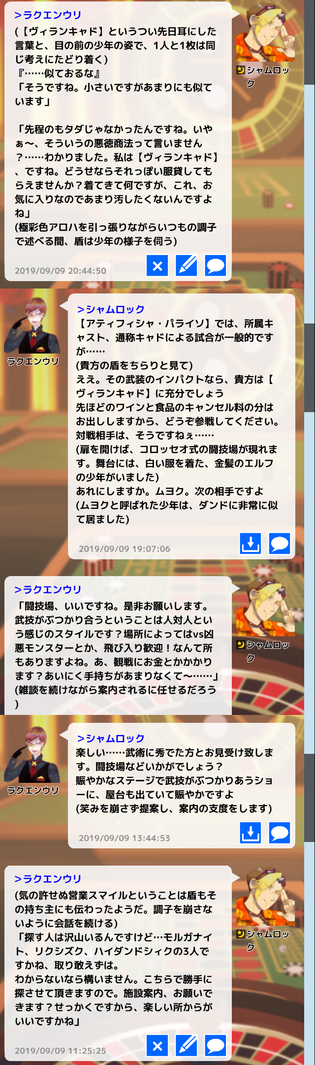 コメントへ といぼっくすさんちのイベント個室、「人造楽土と醒めぬ夢」に参加させていただきました。なんと参加者毎にルートとラスボスが違って一人一人に個室主がレスを返しながら進めていくという作業量がすげーやつなのだ……。おつかれさまでした……!おかげでログ取りとまとめも楽、ということでせっかくのシャムロックルートまとめさせていただきました。タンクらしい戦いをさせていただいて大感謝!ダンド先生との交流も深まってハッピー!(一方的に)親しくなると呼び名から敬称が消えたりします。 こちらボスバトルゲーム画面風になります。ちょうど面子も併せて四人だったので…!!後ろにヴィランキャドの子供たちもいるのよ!