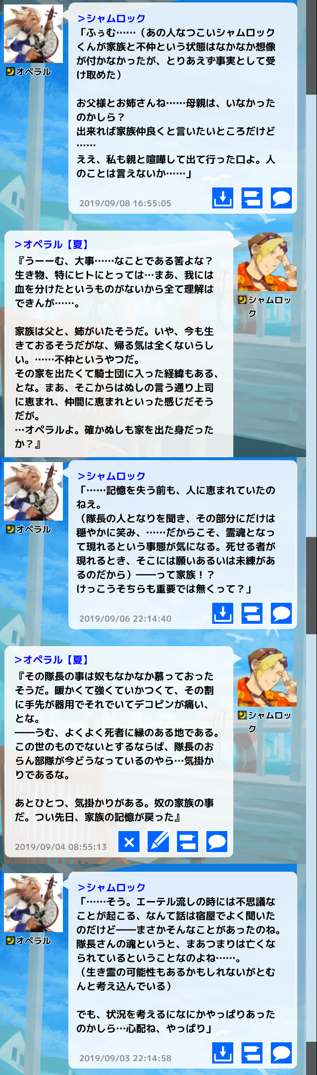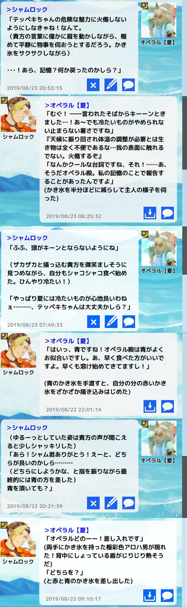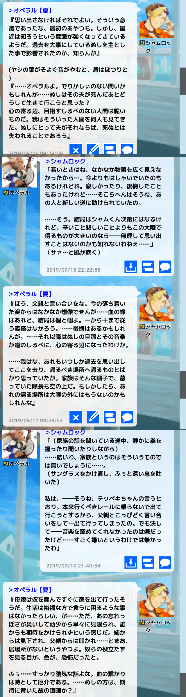 コメントへ ダブルアロハなゆるふわ主従の夏の終わりの日常なお話と、ちょっとシリアスな設定回りのお話と。 流転の大陸の、その輪の外にいるという設定ドラマチックですよねオペラルさん……時が止まった老婆と未来のある若者の主従コンビめっちゃいいな……?とか思っちゃいました。あと旦那さん亡くされた直後の事を考えてみるとつらいものがあるッ……!