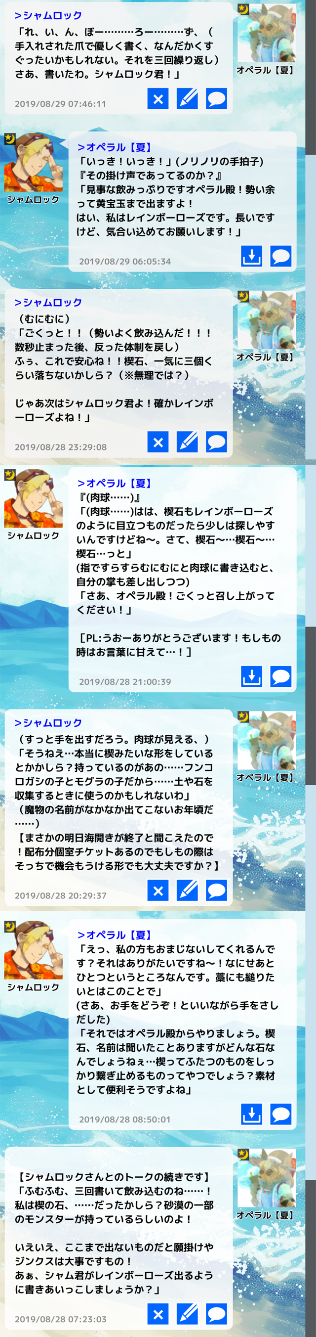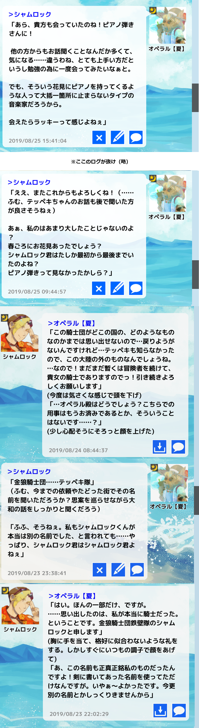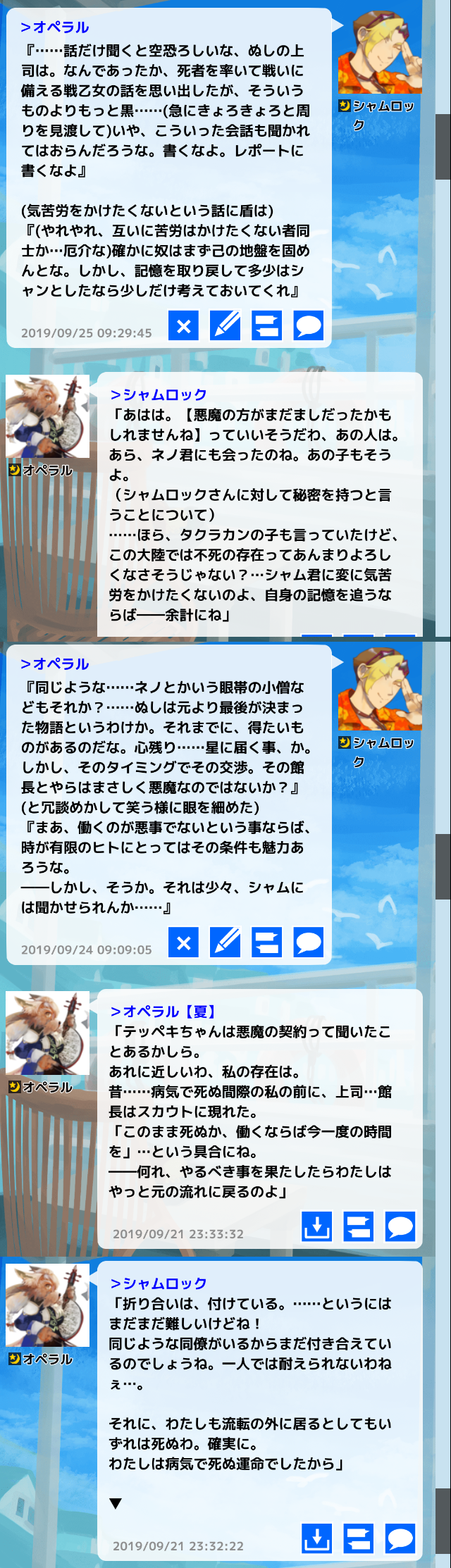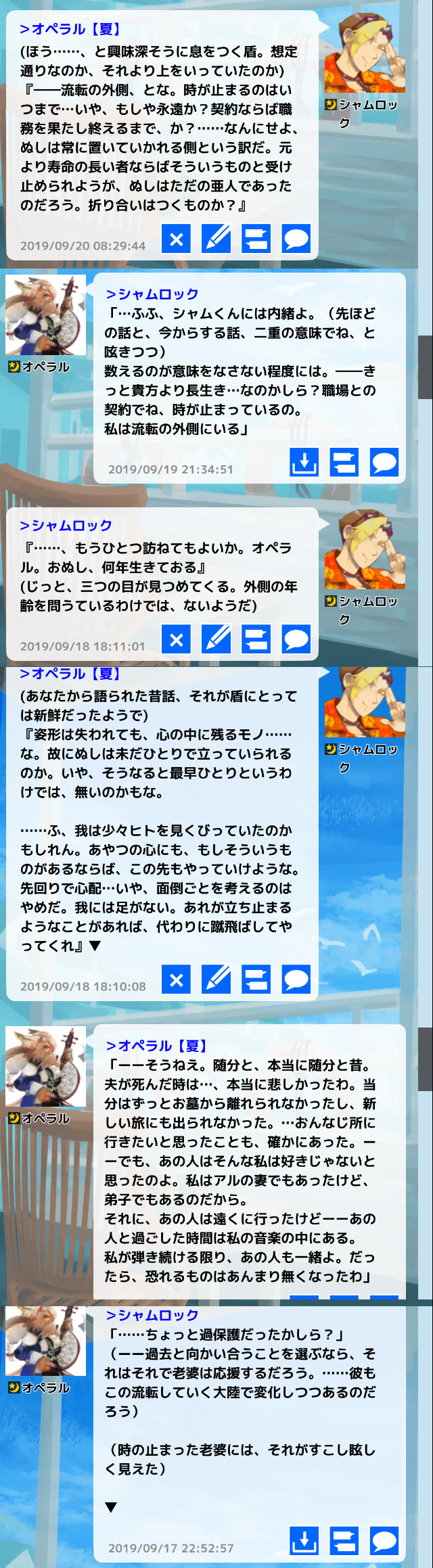 コメントへ ダブルアロハなゆるふわ主従の夏の終わりの日常なお話と、ちょっとシリアスな設定回りのお話と。 流転の大陸の、その輪の外にいるという設定ドラマチックですよねオペラルさん……時が止まった老婆と未来のある若者の主従コンビめっちゃいいな……?とか思っちゃいました。あと旦那さん亡くされた直後の事を考えてみるとつらいものがあるッ……!