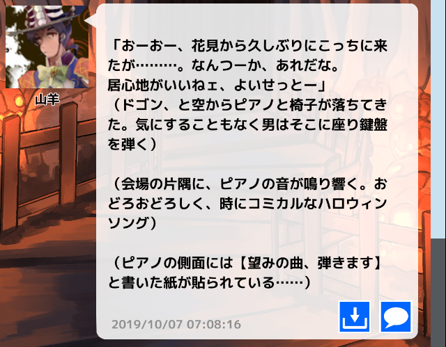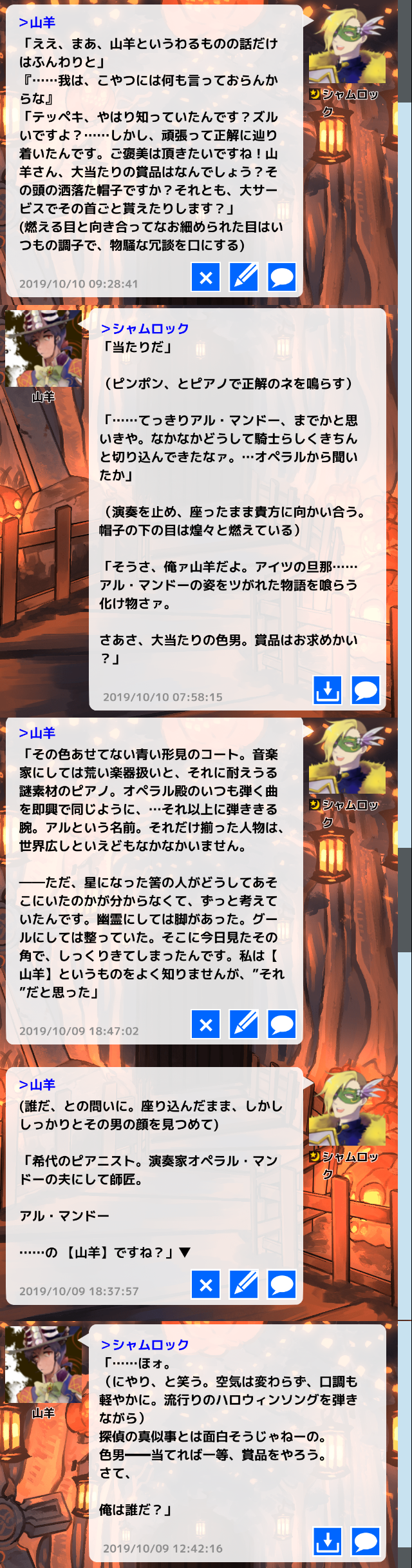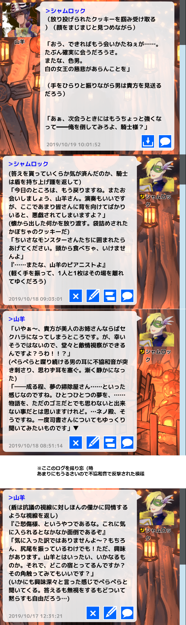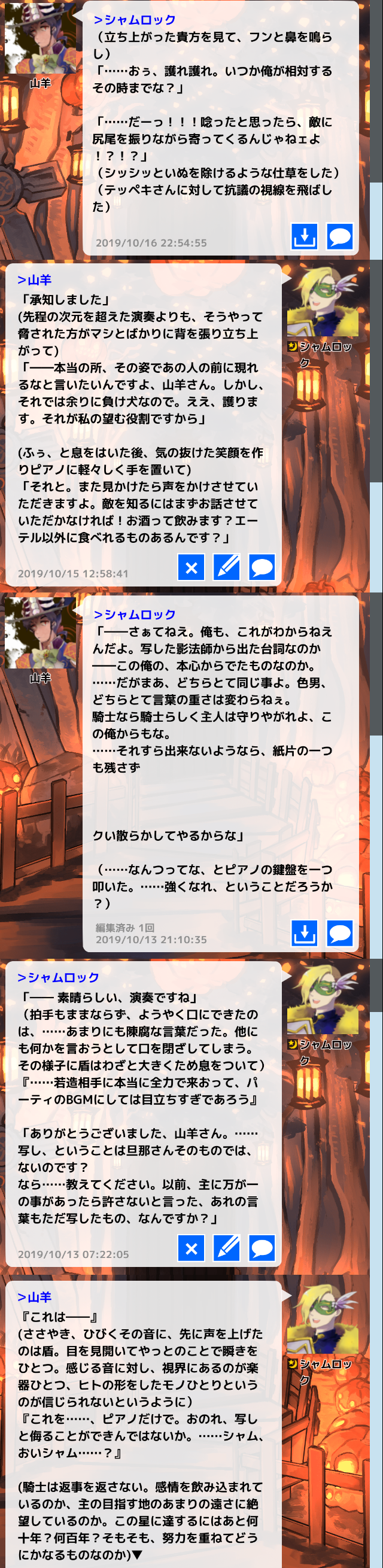 コメントへ ハロウィンにてピアノ弾きな旦那さんと再会し、その正体を確認するシャムロック。それと同時に主の目指すものの困難さも知るのでした。 いやー旦那さんキャラが最高だな……(思わず感想だだもれ)。 苦手なはずの目を薄く開けたりしてるんですが、好きな人々にはあまり見られたくない目を開けるということは嫌われてもいい相手であるということですね。珍しく敵意! これは敵対するわんわんとめぇめぇ。
