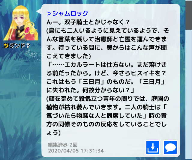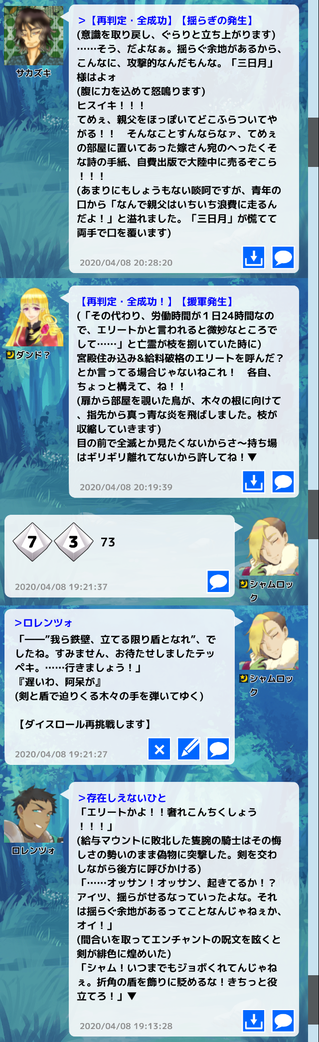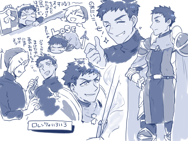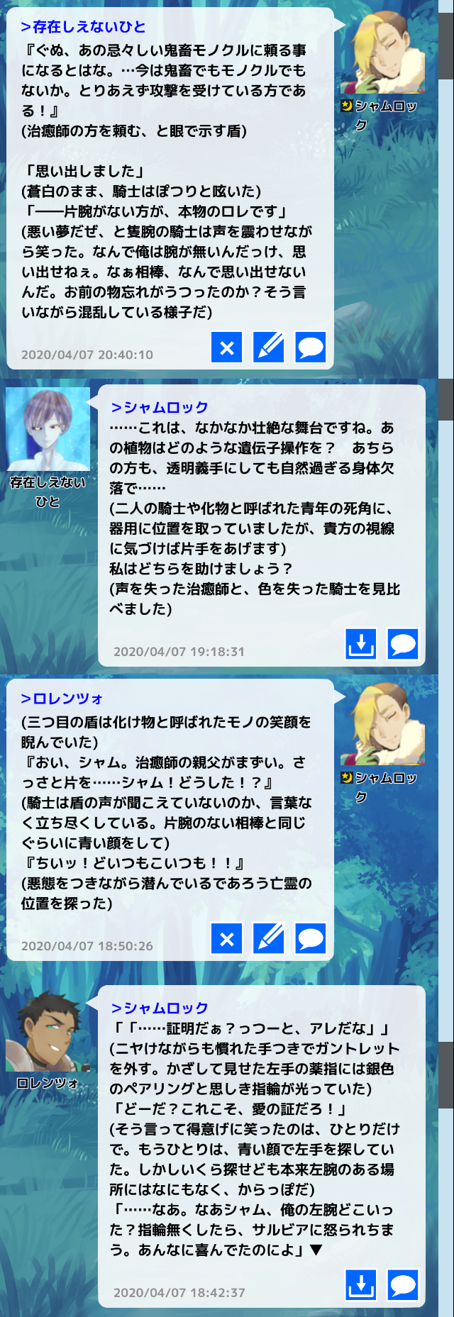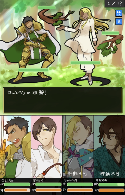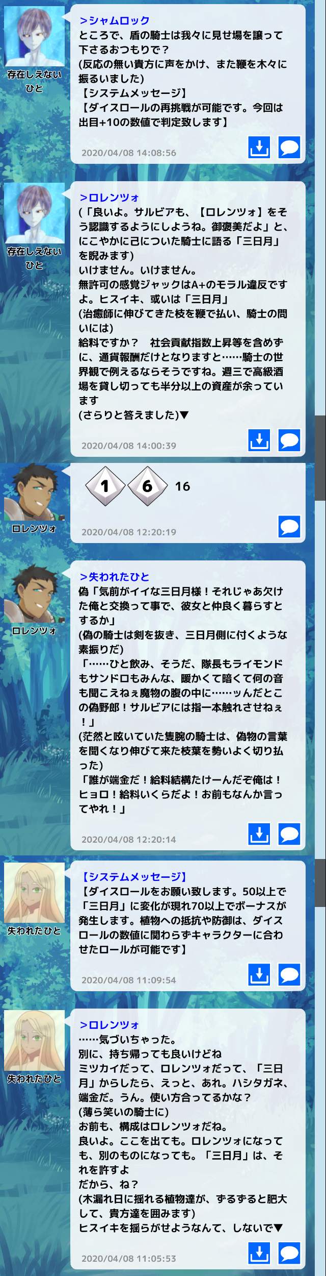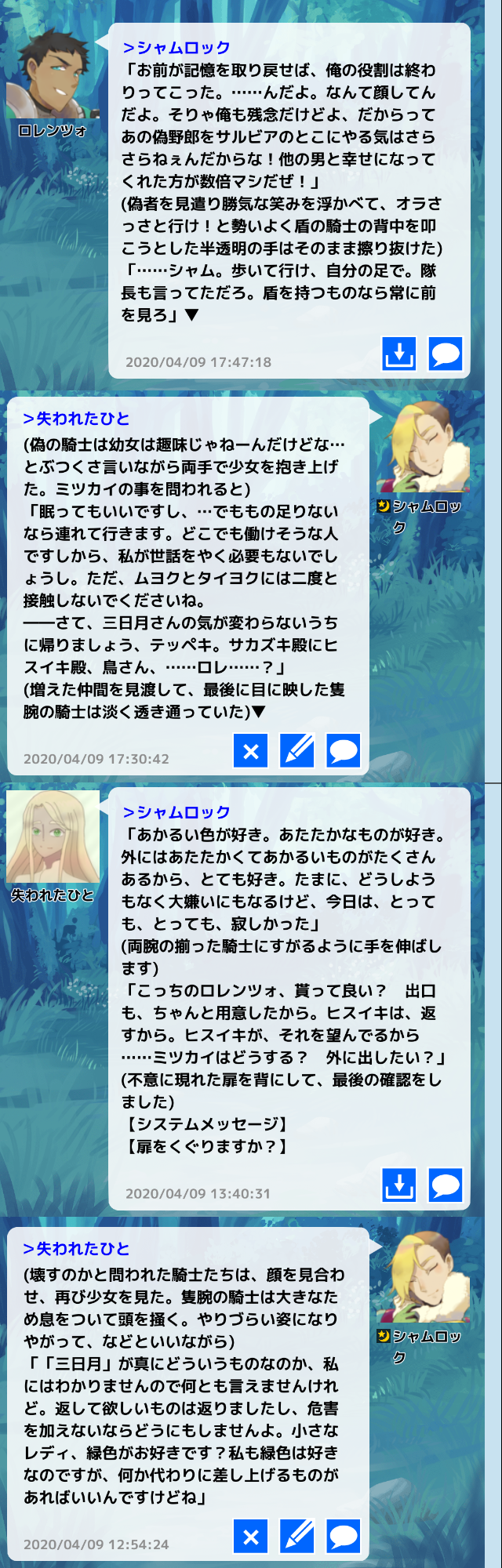 コメントへ 個室「セイエンノミカヅキ」にて、後編でした。忘れていた過去と同僚まわりの設定が思わずがっつり出せたので~素敵な個室に感謝!! 個人的にはシャムVS二人のロレとサカヅキさんVS三日月の問いかけが同時進行しているのが凄くアツかったです。サカヅキさんのやさしさとゆるさ、そして今回見せてくれたシリアスな面にますます好きになってしまう…! 以下はイベント関連とロレンツォまとめです。 ロレンツォ、結構前から設定自体はあったんですがこうしてアイコンつけて喋る機会がくるとは思わず…勢いに乗ってバトルカットも用意してしまった。この時描いた絵の鎧は気に入らなかったのでのちのちリデザインしています。 ぐりまるバトル風です。潜りに来た2人が行動不能になってて、三日月で見つけたキャラが戦ってるのがイイ展開…。 リデザイン後のやつ。金狼騎士団なのでにぶい金色の方がいいねという。 「あばよ、相棒」