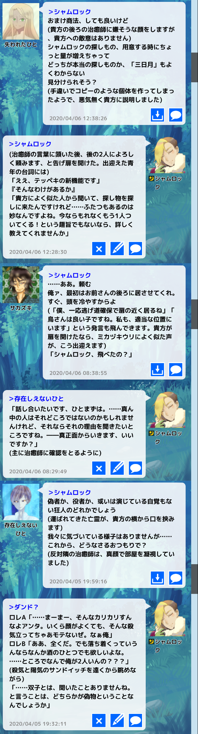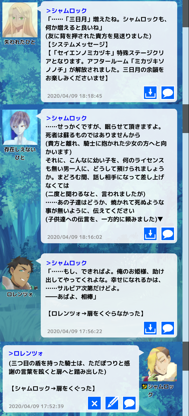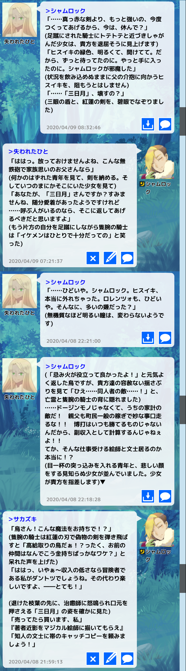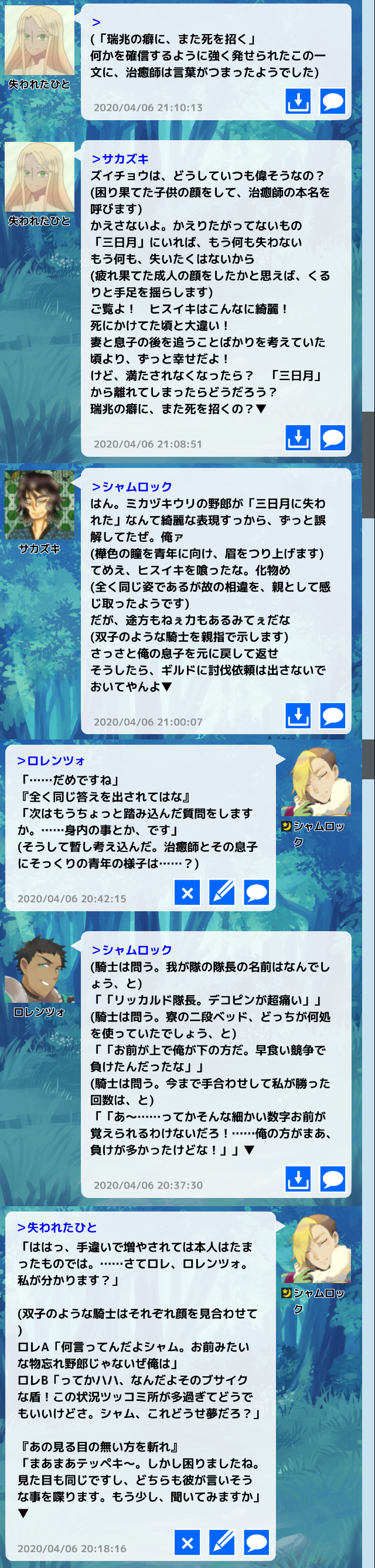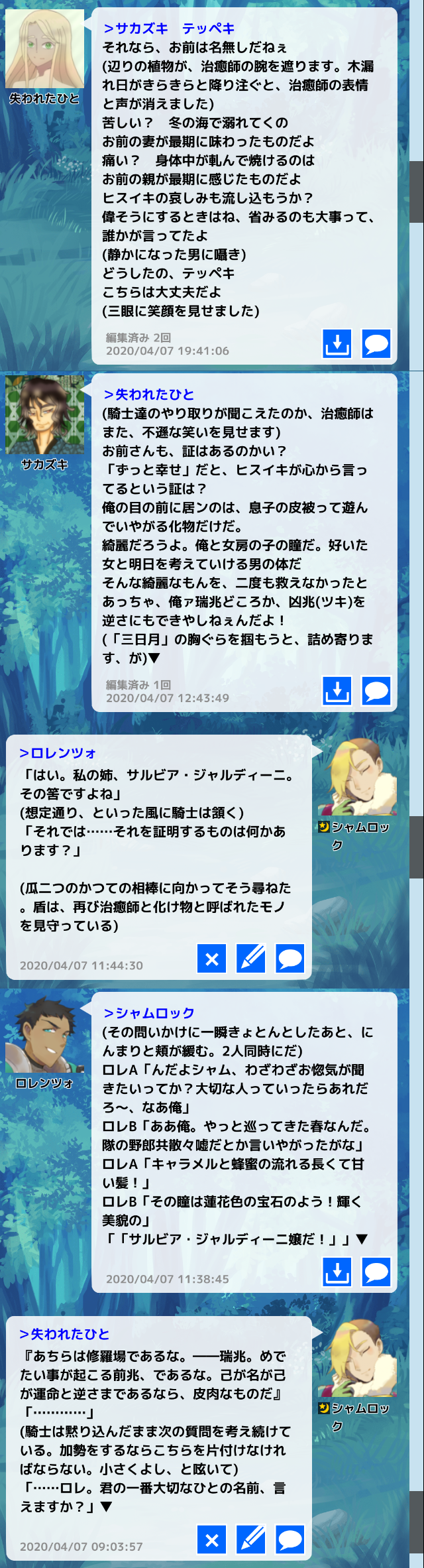 コメントへ 個室「セイエンノミカヅキ」にて、後編でした。忘れていた過去と同僚まわりの設定が思わずがっつり出せたので~素敵な個室に感謝!! 個人的にはシャムVS二人のロレとサカヅキさんVS三日月の問いかけが同時進行しているのが凄くアツかったです。サカヅキさんのやさしさとゆるさ、そして今回見せてくれたシリアスな面にますます好きになってしまう…! 以下はイベント関連とロレンツォまとめです。 ロレンツォ、結構前から設定自体はあったんですがこうしてアイコンつけて喋る機会がくるとは思わず…勢いに乗ってバトルカットも用意してしまった。この時描いた絵の鎧は気に入らなかったのでのちのちリデザインしています。 ぐりまるバトル風です。潜りに来た2人が行動不能になってて、三日月で見つけたキャラが戦ってるのがイイ展開…。 リデザイン後のやつ。金狼騎士団なのでにぶい金色の方がいいねという。 「あばよ、相棒」