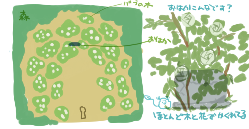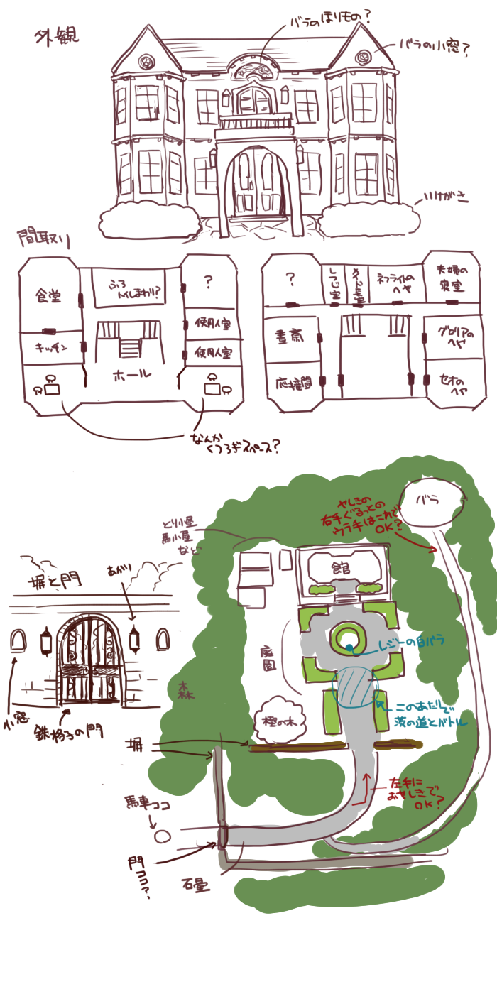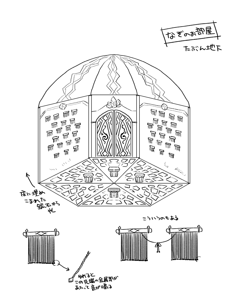 謎部屋のふわっとした設定。紐のやつも素材とか作れば楽だったろうに…。