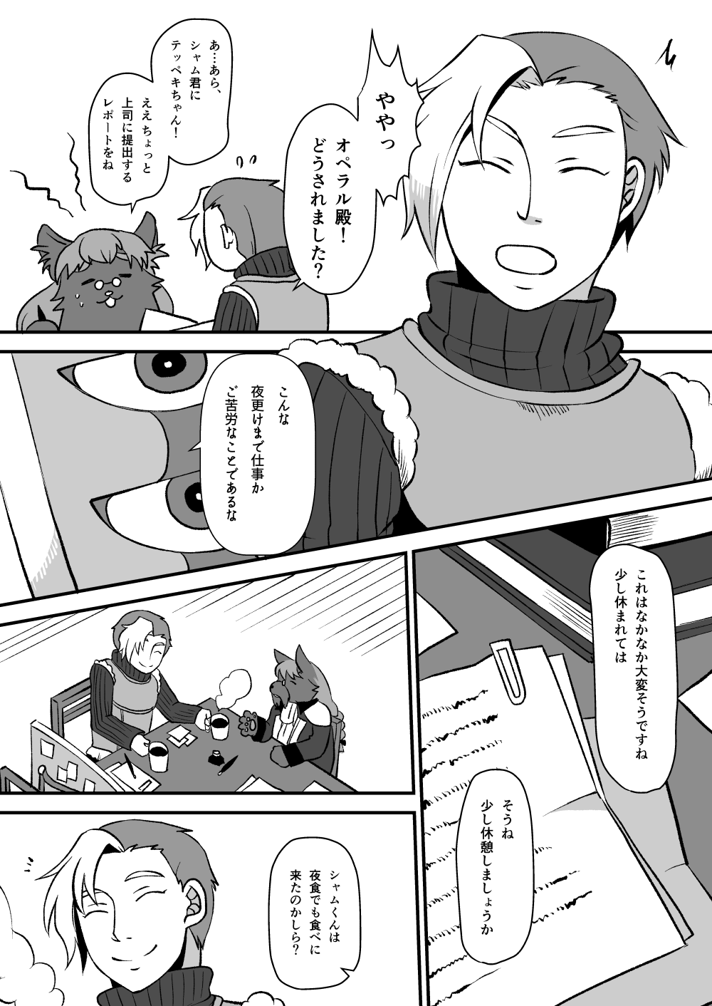 2018年のネーム交換はAURで使っていた自キャラ三人組ジョブチェンジャーズ(+妹)のギャグで、2020年のプロット交換はグリマルシェの自キャラの騎士シャムロックと、その主オペラルさん(PL:地底と星さん)のゆるふわな主従のプロットを漫画にしていただいてます!